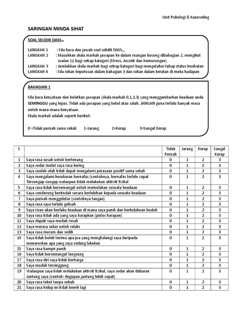 See below for contact details Download Malaysian DASS21 questionnaire. Mari Kenali Kesihatan Minda Kita Saringan DASS Close Menu. Skip to the content.